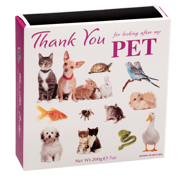 A beautiful decorative thank you box complete with a selection of popular pets from Dogs to Cats, Spiders to Snakes.